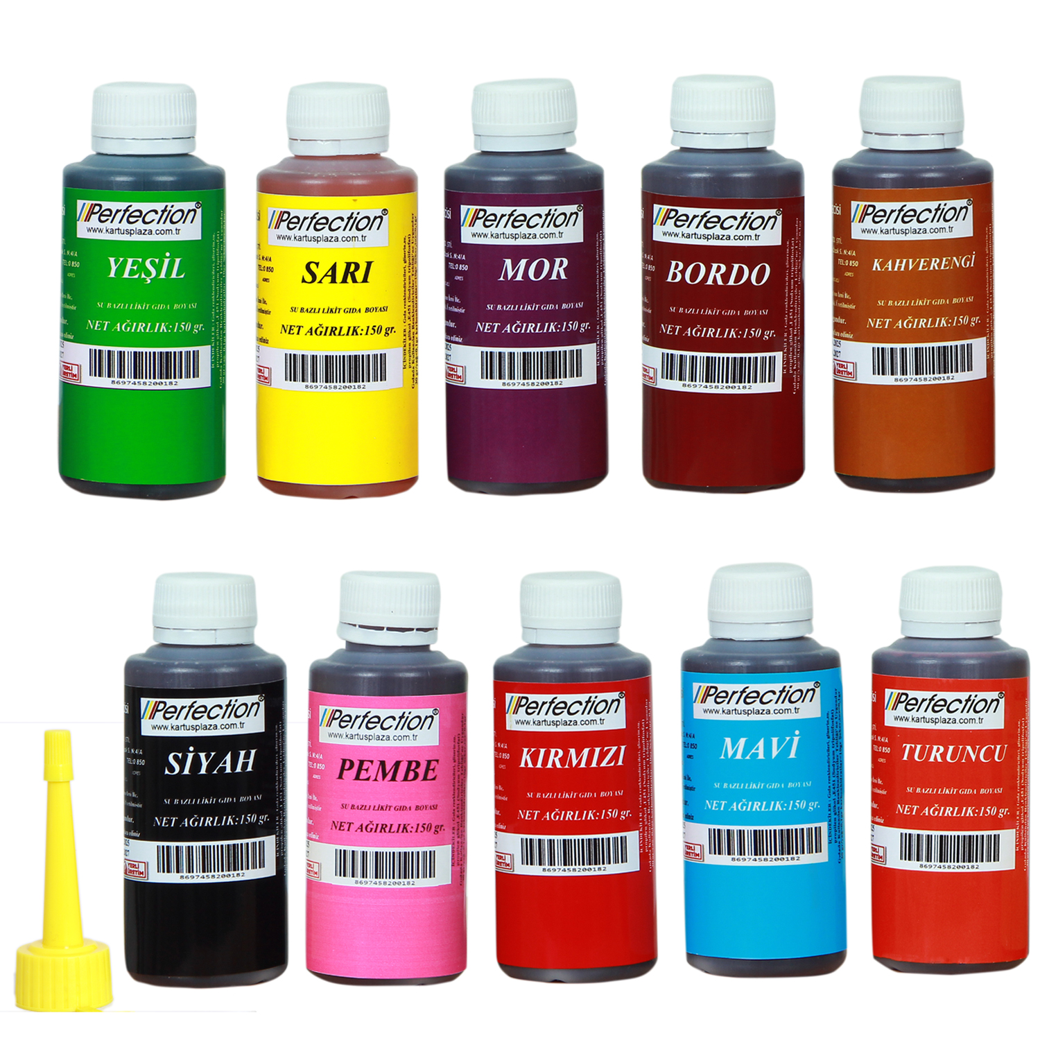 Perfection Chef 10'lu Sıvı Su Bazlı Likit Gıda Boyası Kahverengi Siyah Bordo Pembe Turuncu Sarı Kırmızı Mavi Yeşil Mor 10 x 150 gr .